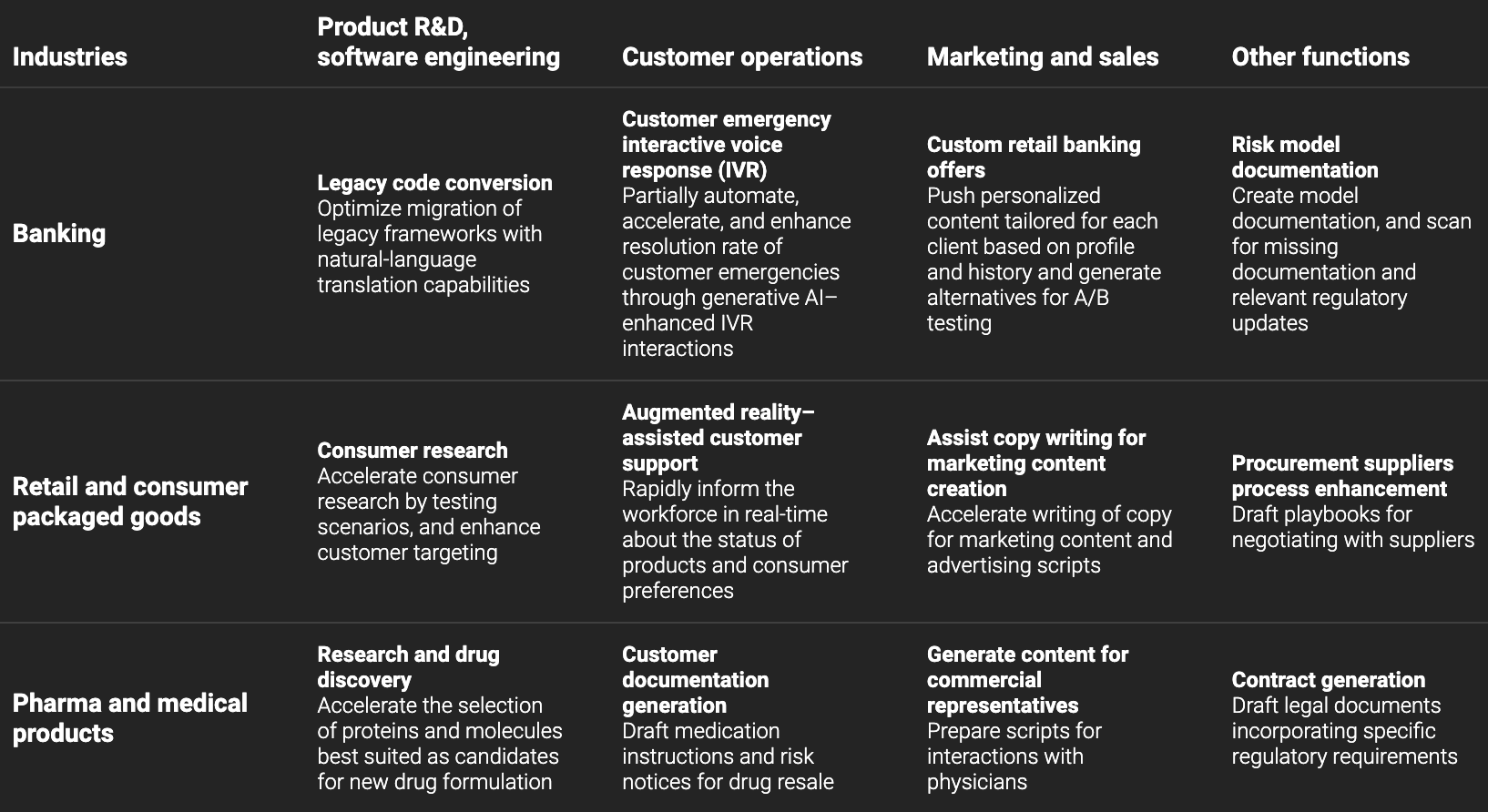 According to a recent report from McKinsey, the disruption of generative AI presents significant potential across multiple industries and functions: